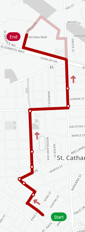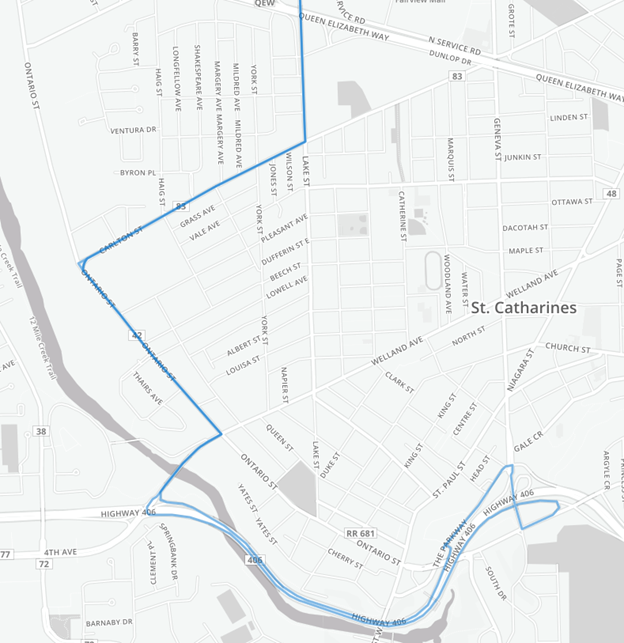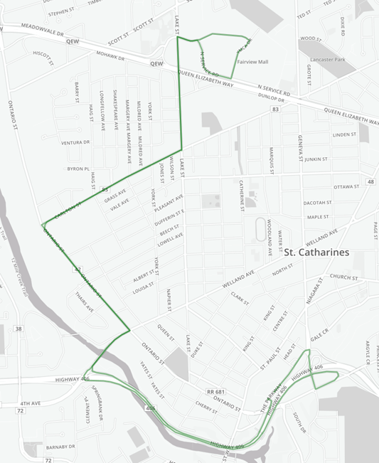 Route 409: Follows Highway 406, Fourth Avenue, Ontario, Carlton, Lake, and North Service/YMCA Drive. A special shuttle bus connects Geneva Street (between Russell Avenue and Fairview Mall) to downtown and back.