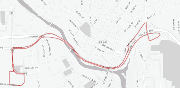 Route 406: Takes Highway 406, Fourth Avenue, Ontario, Carlton, and Lake Street to avoid the usual James Street route.