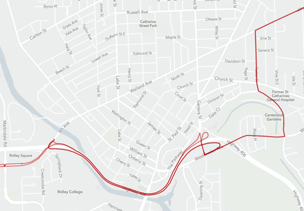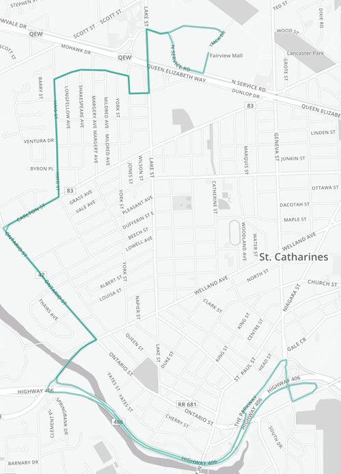 Route 412: Uses Highway 406, Fourth Avenue, Ontario, Carlton, and Haig Street. A shuttle bus runs on Catherine Street, connecting passengers between the Russell/Geneva area and downtown, then to Fairview Mall for regular bus connections.