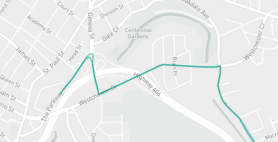 Route 404: Uses Parkway, Geneva, Westchester, and Oakdale instead of the regular route through Gale Crescent, Riordon Street, and Queenston Street.