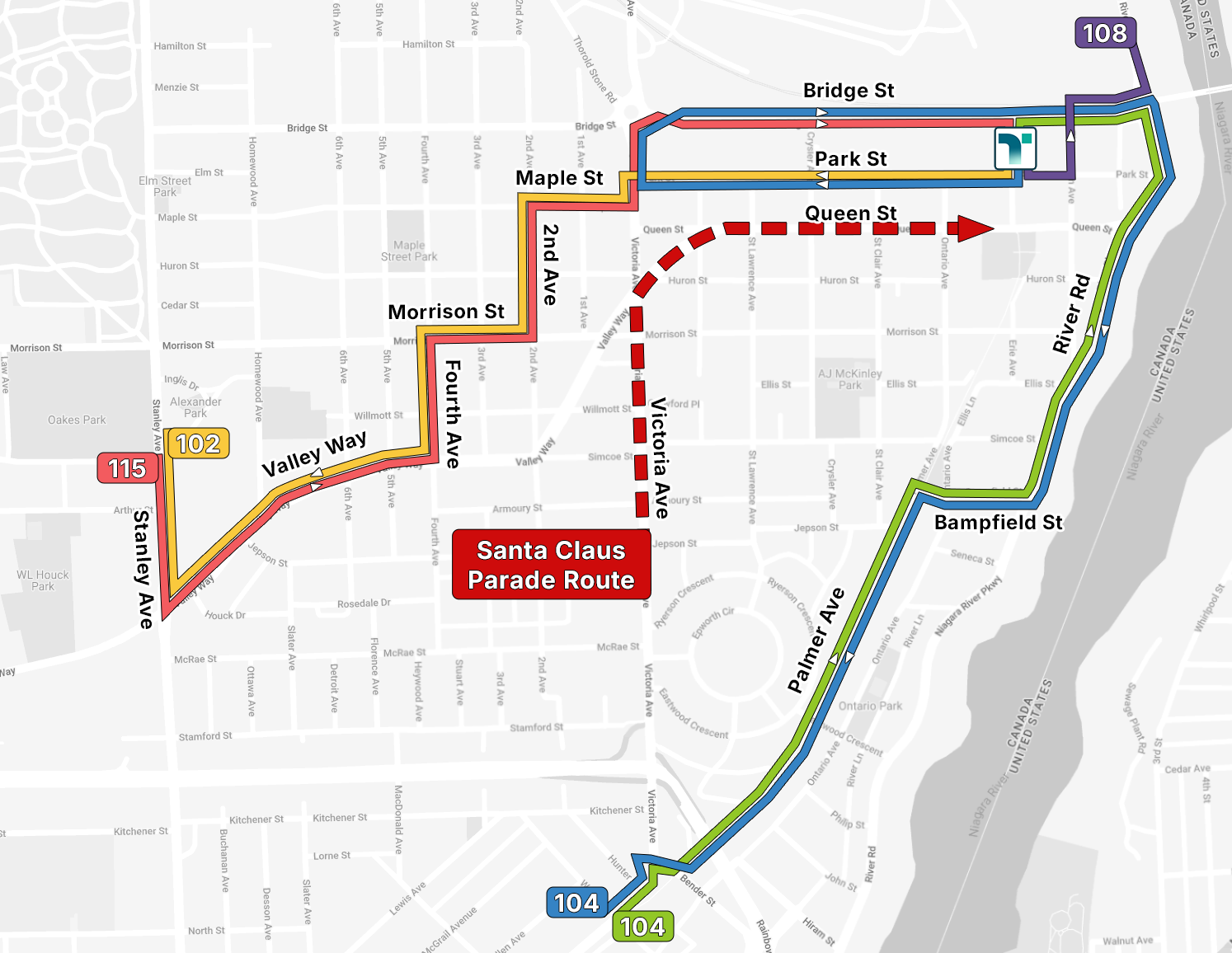 Saturday, November 15 - Niagara Falls Santa Claus Parade bus detours will be in effect; times may vary by route.