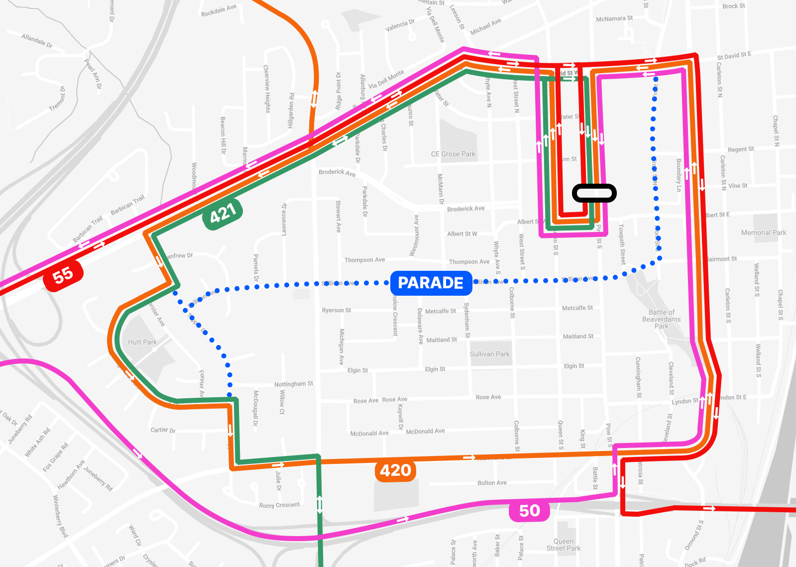 Saturday, November 29 - Thorold Santa Claus Parade bus detours will be in effect from 3:00 p.m. to 6:30 p.m.